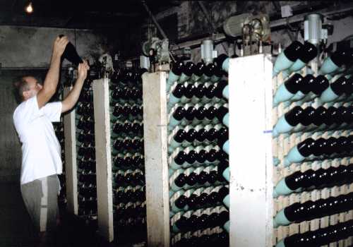 Monsieur Bergeronneau has such a machine - not ’state-of-the-art’, he told us, but very practical. The bottles are held in iron cradles and a complicated system of gears and chains does the remuage automatically. However, larger bottles - magnums (1½ litres) and jeroboams (3 litres) - are still dealt with by hand.