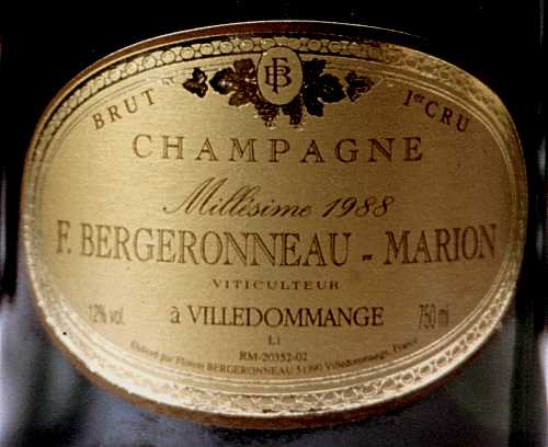 The following week he gave us a tariff and a bon de commande (order form) from F.Bergeronneau-Marion, propriétaire-récoltant (literally ’harvester’, but meaning ’grower’). The prices were very interesting indeed, with bottles ranging from 73 francs (about £7.70) for basic Brut and Demi-sec to 108 francs (£11.35) for Brut Millesimé 1988 - a vintage Champagne from an excellent year. Given that basic wines from the Grandes Marques (Moët et Chandon, Veuve Clicquot, Mumm and the rest of the 24 houses that have awarded themselves this exalted status) sell for at least £13 in French hypermarkets and well over £20 in Britain, and big-name vintage bubbly commands silly prices, we decided to investigate.